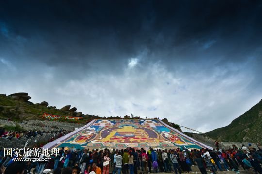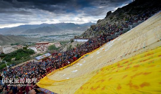 國(guó)家旅游地理 西藏拉薩8月6日訊 8月6日,拉薩哲蚌寺舉行展佛儀式。當(dāng)日,以西藏最大的格魯派寺廟哲蚌寺展佛為開(kāi)端的雪頓節(jié)在拉薩拉開(kāi)序幕。每年藏歷六月底七月初是西藏傳統(tǒng)的節(jié)日“雪頓節(jié)”。在藏語(yǔ)中,“雪”是酸奶子的意思,“頓”是“吃”“宴”的意思,“雪頓節(jié)”按藏語(yǔ)解釋就是吃酸奶子的節(jié)日,因此又叫“酸奶節(jié)”。因?yàn)?ldquo;雪頓節(jié)”期間有隆重?zé)崃业牟貞蜓莩龊鸵?guī)模盛大的曬佛儀式,所以有人也稱(chēng)之為“藏戲節(jié)”“曬佛節(jié)”。 /新華社記者 普布扎西攝