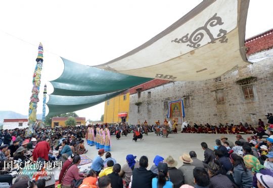 8月6日,在西藏堆龍德慶縣乃瓊鎮(zhèn)甲熱村舉行的雪頓節(jié)曬佛慶典上,甲熱村覺木隆藏戲團的演員們入場表演。