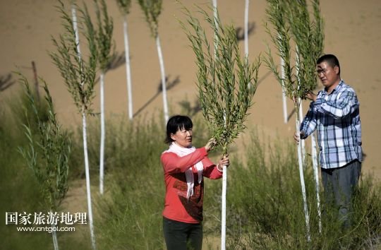 國家旅游地理 寧夏銀川10月11日訊 圖為顧蕓香(8月14日攝) 14年來,寧夏靈武農(nóng)民顧蕓香的心,不知隨著沙漠里的樹“生生死死”了多少回。