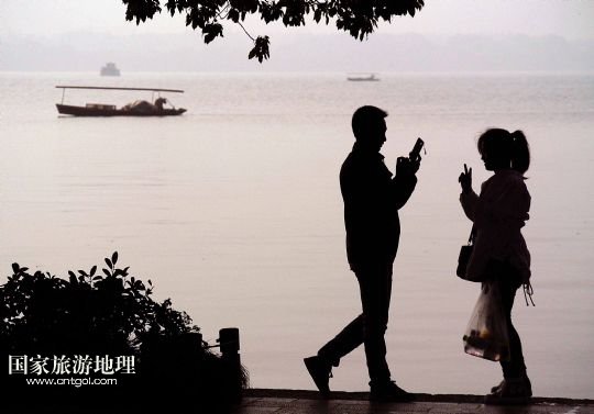 國(guó)家旅游地理 浙江杭州11月5日訊 11月4日,一對(duì)男女青年在西湖邊拍照留影。生活在杭州的人是幸福的,因?yàn)楹贾萦形骱?。清晨的西湖,恬靜,淡雅,柔美,朦朧。岸邊,堤上,健身鍛煉的市民、散步賞景的游人,在湖水、小橋、亭閣、石欄的襯伴下,構(gòu)成了一幅幅剪影效果的水墨圖畫(huà)。 /新華社記者王頌攝