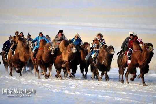 國家旅游地理 內(nèi)蒙古錫林郭勒1月5日訊 1月5日,牧民們在10公里駱駝速度賽比賽中。當日,內(nèi)蒙古烏珠穆沁駱駝文化節(jié)在西烏珠穆沁旗烏蘭哈拉嘎蘇木舉行。來自呼倫貝爾、鄂爾多斯以及蘇尼特和烏珠穆沁草原的牧民帶著200多峰駱駝在白雪皚皚的草原上進行駱駝選美、10公里駱駝速度賽等以比賽活動和民俗風情表演,展示內(nèi)蒙古草原上獨特的駱駝文化。 /新華社記者 任軍川 攝