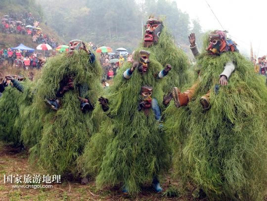 國(guó)家旅游地理 廣西柳州2月20日訊 2月16日,一名苗族青年戴著面具、披著芒草,扮成 “芒哥”跳舞。當(dāng)日是農(nóng)歷正月十七,地處深山的廣西柳州市融水苗族自治縣安陲鄉(xiāng)在江門(mén)苗寨舉行傳統(tǒng)的“芒哥節(jié)”。眾多苗族男性青少年戴著面具、披著芒草、扮成“芒哥”起舞,為人們驅(qū)邪避禍,送去新春的祝福。據(jù)介紹,演“芒哥”是當(dāng)?shù)孛缂胰霜?dú)具特色的新春傳統(tǒng)活動(dòng)之一。 /新華社發(fā)(龍濤 攝)