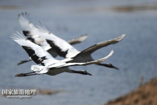 4月15日,丹頂鶴在向海自然保護(hù)區(qū)內(nèi)飛翔。