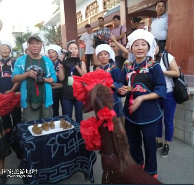 這是黔南惠水縣好花紅布依風(fēng)情寨,為了歡迎遠(yuǎn)方客人的到來(lái),布依族人在寨門前擺滿酒杯唱起山歌。在進(jìn)寨前客人都要喝三杯攔門酒,喝完才能進(jìn)入寨中。同時(shí),布依族習(xí)俗中,遠(yuǎn)方客人到來(lái),坐上木馬,喝完三杯米酒也寓意著會(huì)交好運(yùn)。